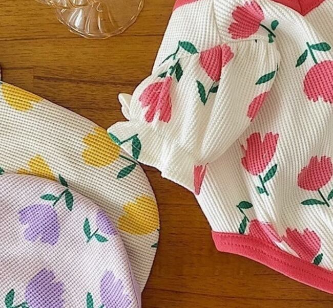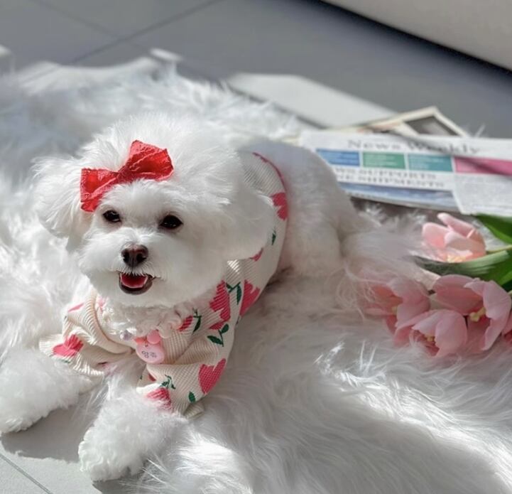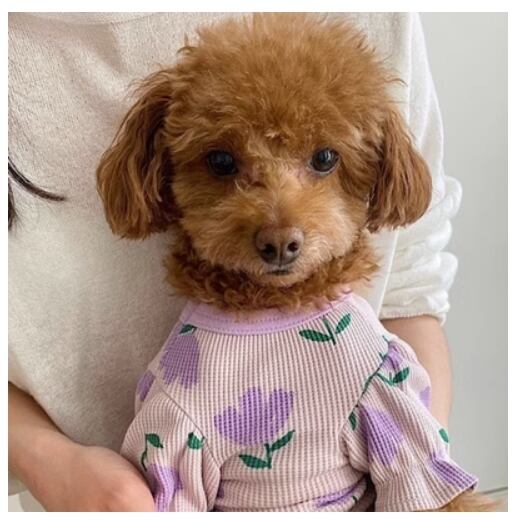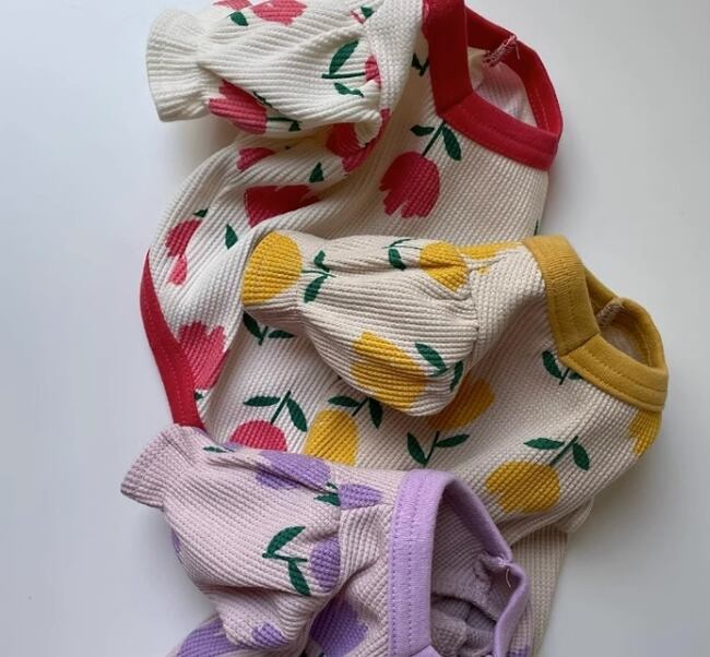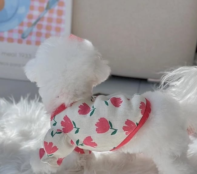 可愛らしい犬用シャツです。チューリップ柄の、薄手で涼しい半袖シャツ。