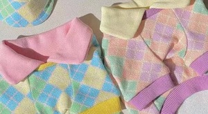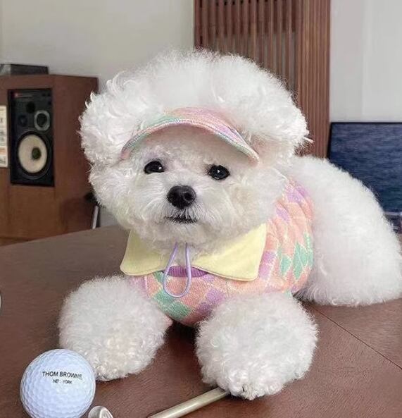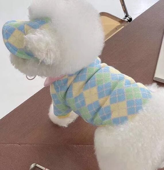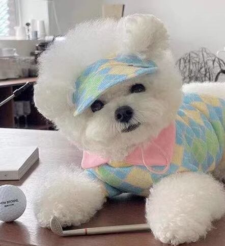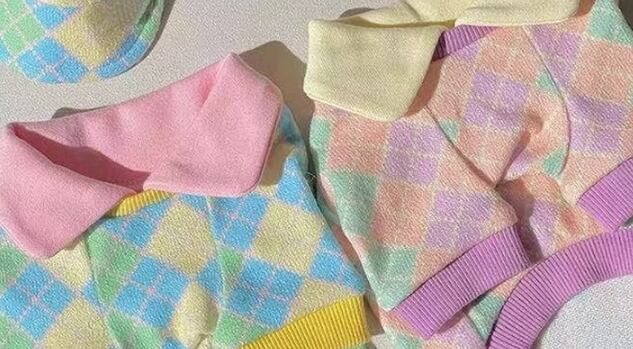 この襟付きのドッグシャツは、小型犬から中型犬まで幅広く対応しています。カラフルなカレッジ風のアーガイル柄が魅力的で、袖付きや襟のディテールがアクセントになり、おしゃれで個性的な印象を与えます。