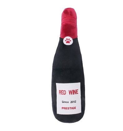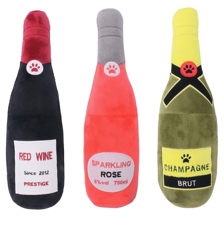お酒ボトルをイメージした楽しいペット用ぬいぐるみです。