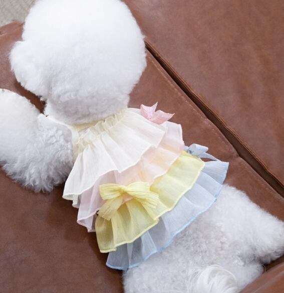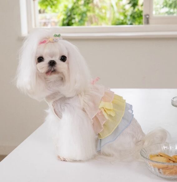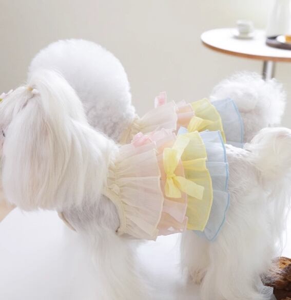 多段になったチュールが犬の動きに合わせて揺れ、まるで夢の中にいるような幻想的な雰囲気を演出します。特別なイベントやパーティーなどで、愛犬の存在感を一層際立たせるファッションアイテムとなっています。