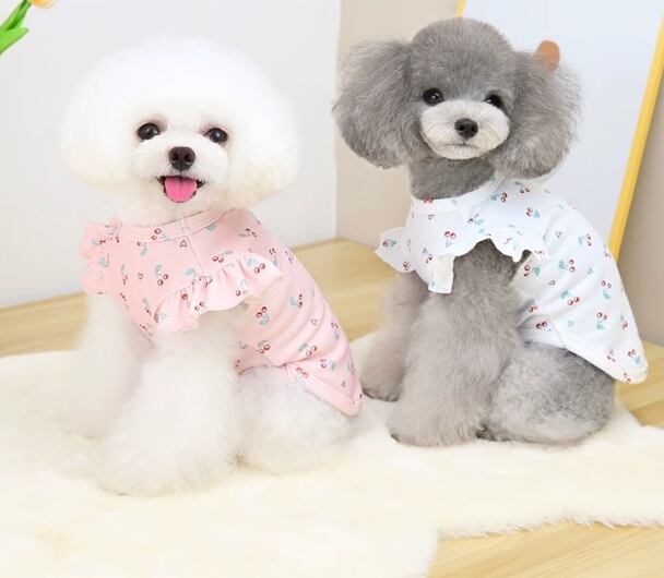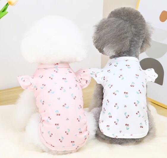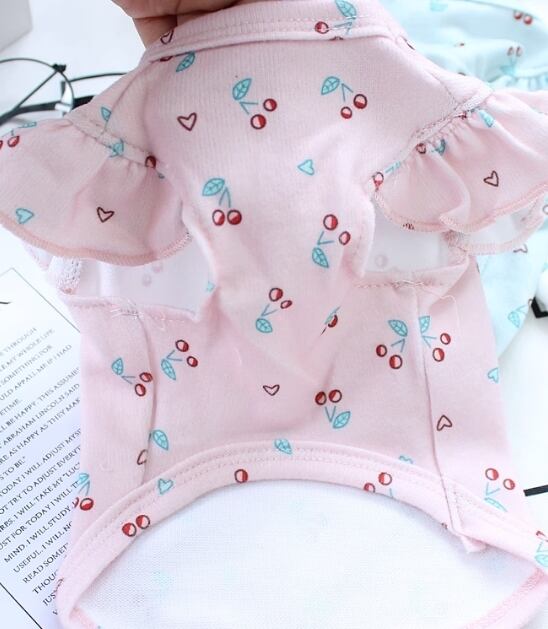 さわやかなさくらんぼ柄が特徴の夏服です。半袖デザインで涼しさを感じられるだけでなく、愛犬のファッションに可愛らしさをプラスします。さくらんぼの甘酸っぱい魅力が夏のおしゃれを彩り、愛犬の涼しげなファッションを叶えるアイテムです。