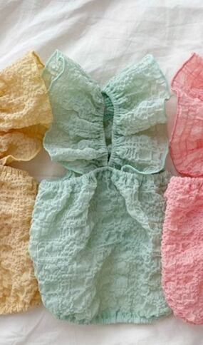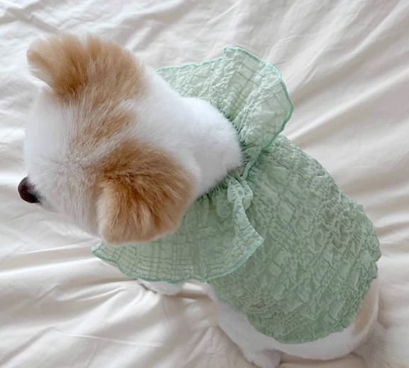 シャーリング素材が涼しげな印象を与えながら、肩部分のフレアデザインが愛犬のファッションに優雅さをプラスします。