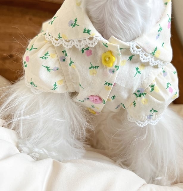 キャット 猫 ドッグ 犬 小型犬 室内着 ブラウス シャツ セミフレア フリル 襟付き 袖付き 半袖 お花 ボタン かわいい きれいめ シンプル 上品 おしゃれ レトロ エレガント 主役級 かっちり ラブリー キュート フェアリー 都会的 ラグジュアリー カレッジ風 プレッピー フレンチ シック 花柄 柄 春 夏 ロングシーズン サマーシーズン 春服 夏服 男の子 女の子 成犬 成猫 デート お出かけ パーティー イベント 旅行 公園 休日 ガーデン カフェ 庭 散歩 ウォーキング 室内 おうち