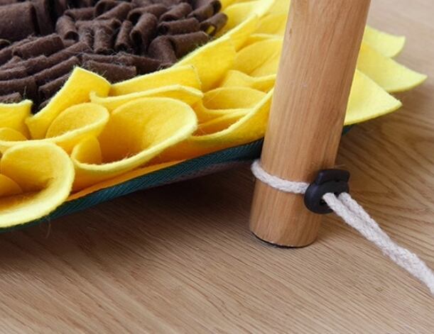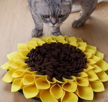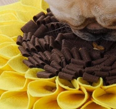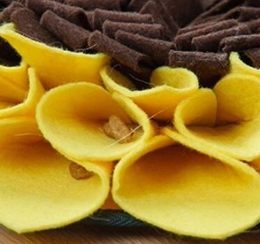ひまわりの形状をしたノーズワークトイマットです。愛犬の嗅覚を刺激し、ひまわりの花びらにおやつを隠すポケットとしても利用できます。太陽のようなひまわりで楽しい冒険を提供し、知育とエンターテイメントを愛犬に提供するアイテムです。